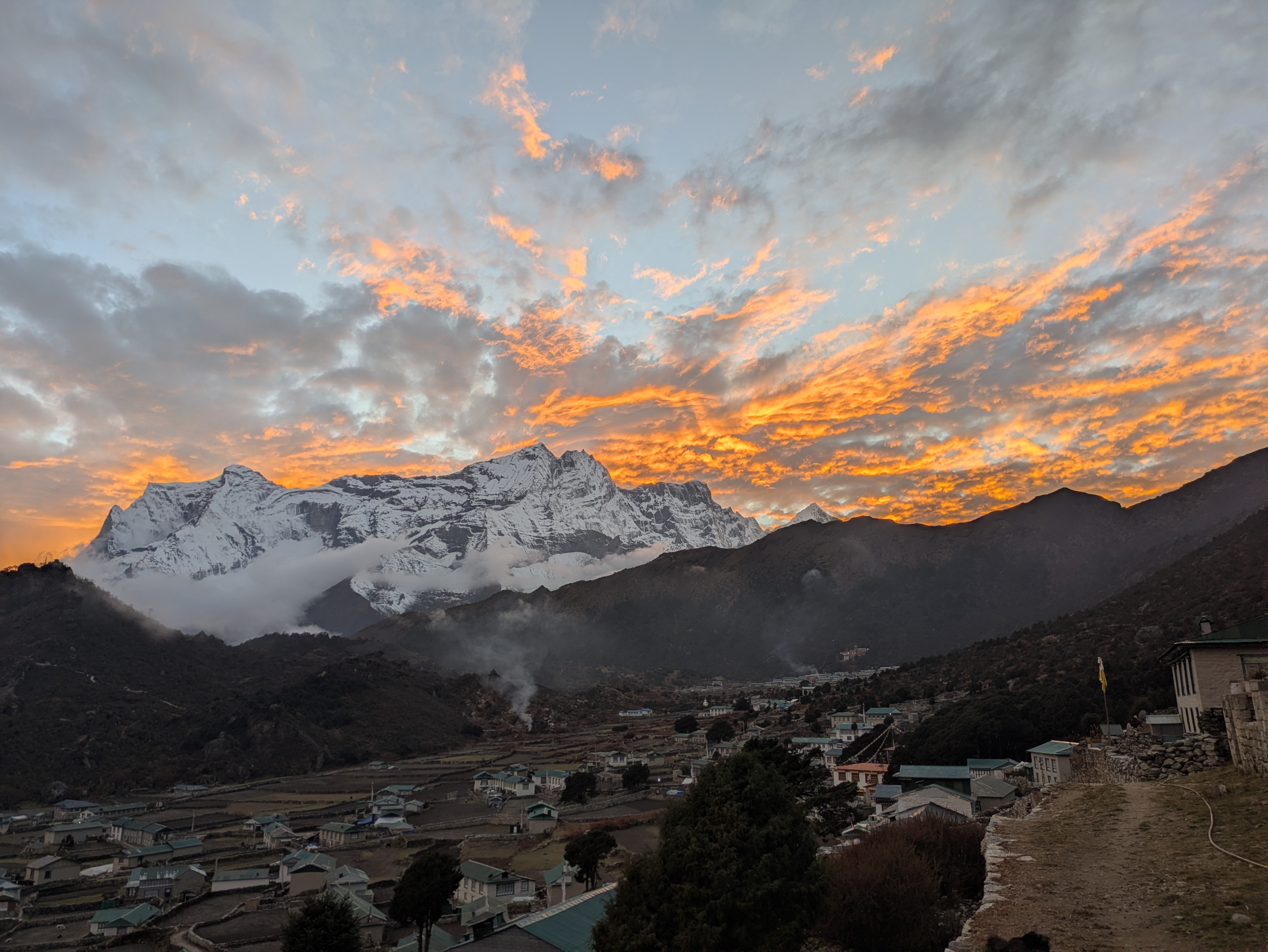 Avec Adam nous retournons au monastère admirer un coucher de soleil magnifique. En réalité le soleil est caché derrière les sommets des monts Kongde Ri, on ne peut que le deviner disparaître au delà des montagnes. Le ciel passe du bleu à l’orange puis au rose.