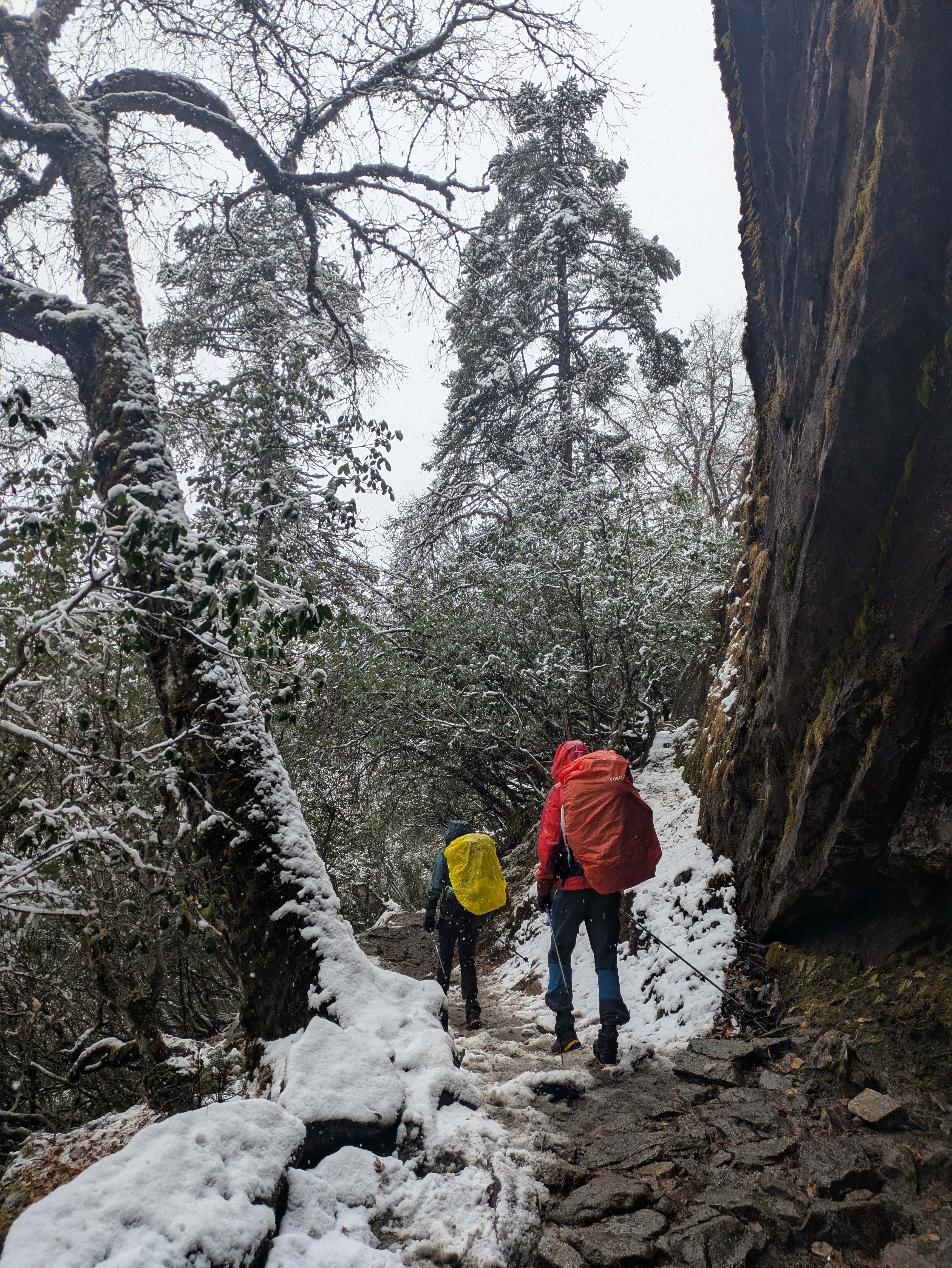 De l’autre côté du lac, nous retrouvons le groupe de Népalais sous un abri. Ils prennent une pause et nous disent que c’est à notre tour maintenant de marcher devant et de faire la trace. Emma et Erwan se prêtent au jeu et je les accompagne. Ils sont gardiens de refuge dans les Alpes et faire la trace dans la neige n’est pas un souci pour eux. Très vite, nous nous retrouvons tous les trois au milieu de la neige à s’inventer un chemin le long de la rivière. Des chiens qui étaient avec le groupe de Népalis nous suivent en sautant dans la neige. Eux aussi ont l’air de s’amuser.
