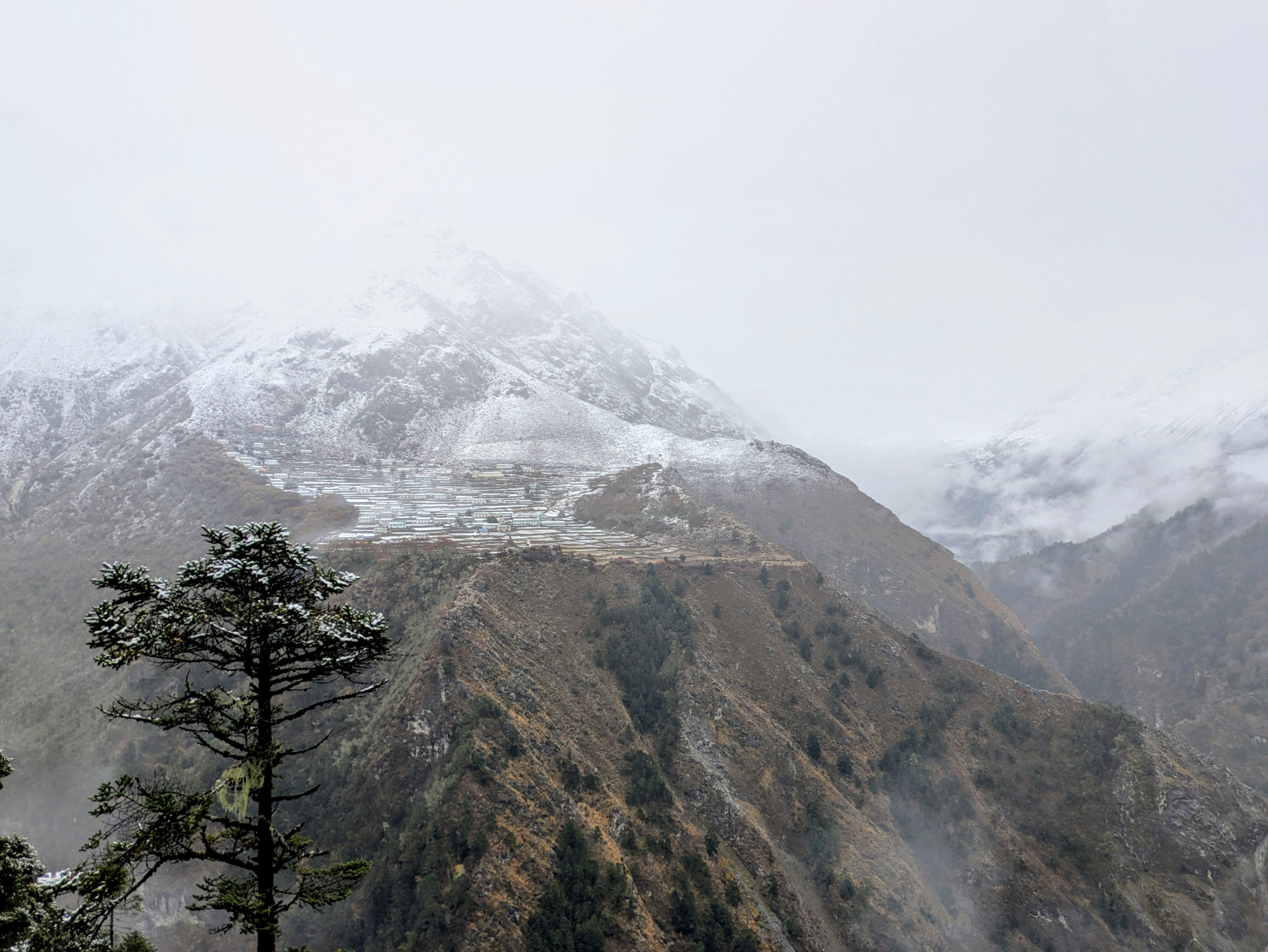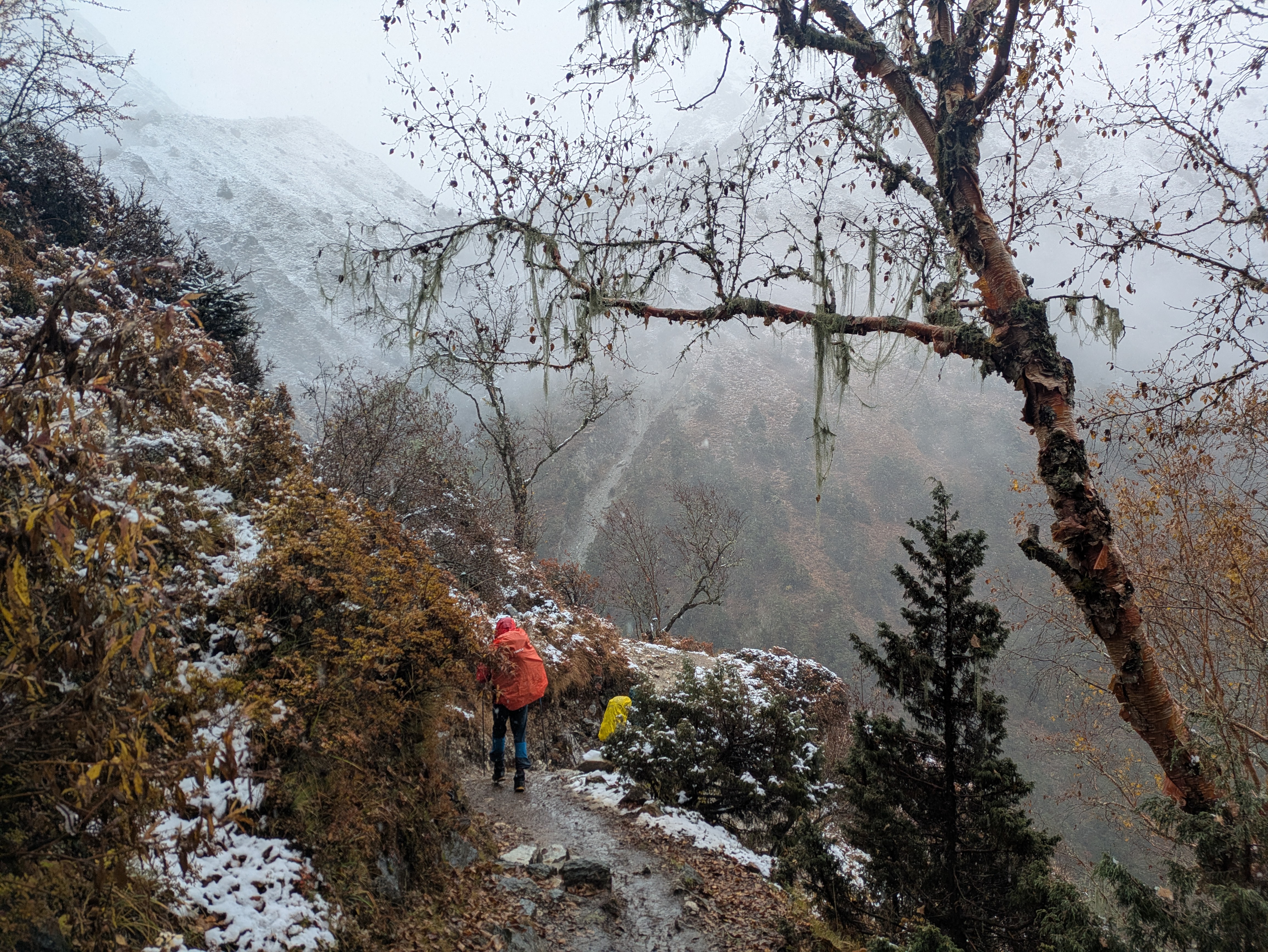 La neige est poudreuse et légère. Un peu avant Macchermo, au bout de 6 km, nous retrouvons une piste plus grande qui vient du versant opposé. J’ai l’impression de revenir d’un coup à la civilisation en croisant d’autres personnes. Il y a un peu moins de neige qu’à Gokyo, environ 15 cm, peut-être 20. Une petite pause chocolat chaud et la descente continue. 6 km de plus et nous arrivons à Dhole pour un autre chocolat chaud. Ici la neige devient de plus en plus boueuse. Cela rend tout de suite la marche beaucoup moins agréable. Nous sommes sortis des nuages et au loin, on peut deviner les versants des montagnes.