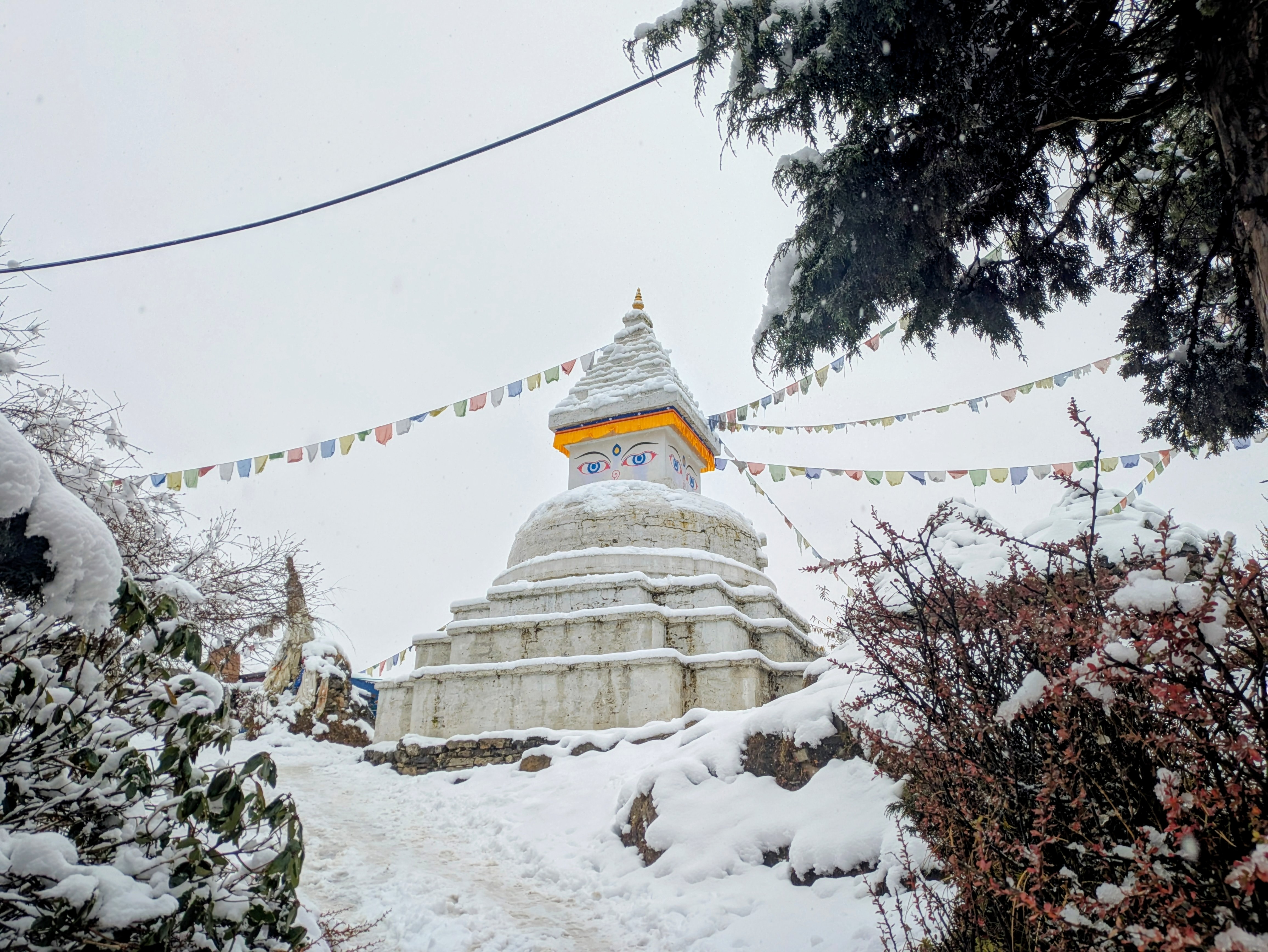 Après le pic de Khunde, je me sens fatiguée et un peu ailleurs. J’arrive comme par magie devant le magnifique monastère de Khumjung. Je demande à un moine si je peux méditer quelque part. Il m’indique un escalier qui mène à une grande salle au parquet vitré. Je perds quelque peu la notion du temps. Méditer est un acte simple qui m’apporte beaucoup de calme et de sérénité. Avec la paix intérieure, des ailes poussent pour nous porter, nous soutenir et nous guider. J’en oublie même de faire des photos de l’intérieur (décidément pas beaucoup de photos aujourd’hui), je ne les ferai cinq jours plus tard en repassant (mais pas avec le même temps 👀 🌨️). Je ne visite même pas la salle inférieure qui apparemment abrite un scalp de yéti.