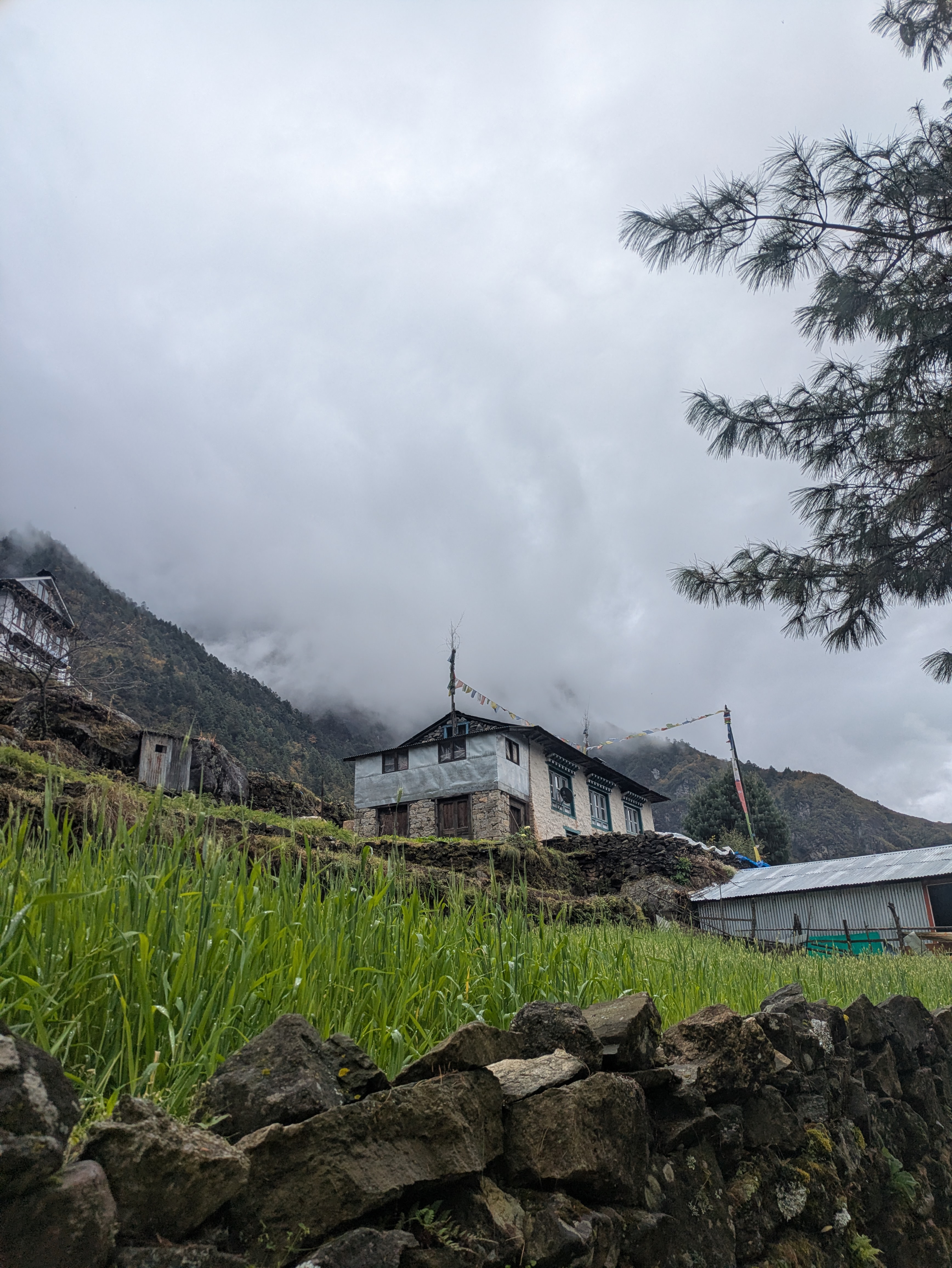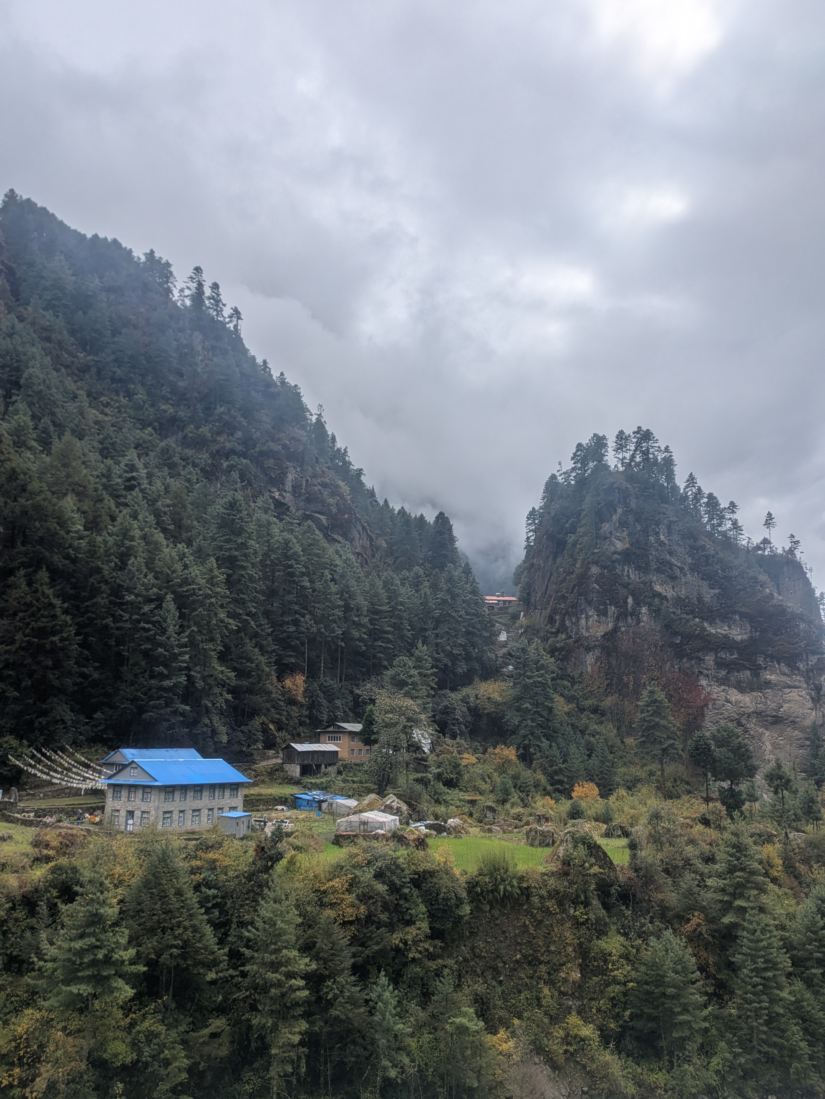 Je traverse plusieurs petits villages de lodges plus ou moins animés. À l’entrée et la sortie de chacun, il y a des murs pleins de moulins à prières et des pierres immenses couvertes de mantras. Quelques fois, il y a un ou deux enfants qui tentent de me donner une fleur contre quelques billets. Je les esquive avec un sourire, ne sachant comment prendre cette interaction. Pour ce premier jour de marche, je n’ai quasiment pas pris de photos, je remplissais mes yeux et je voulais juste être là : profiter du début de la montagne, des vallées de jungle et de cette douce solitude.
