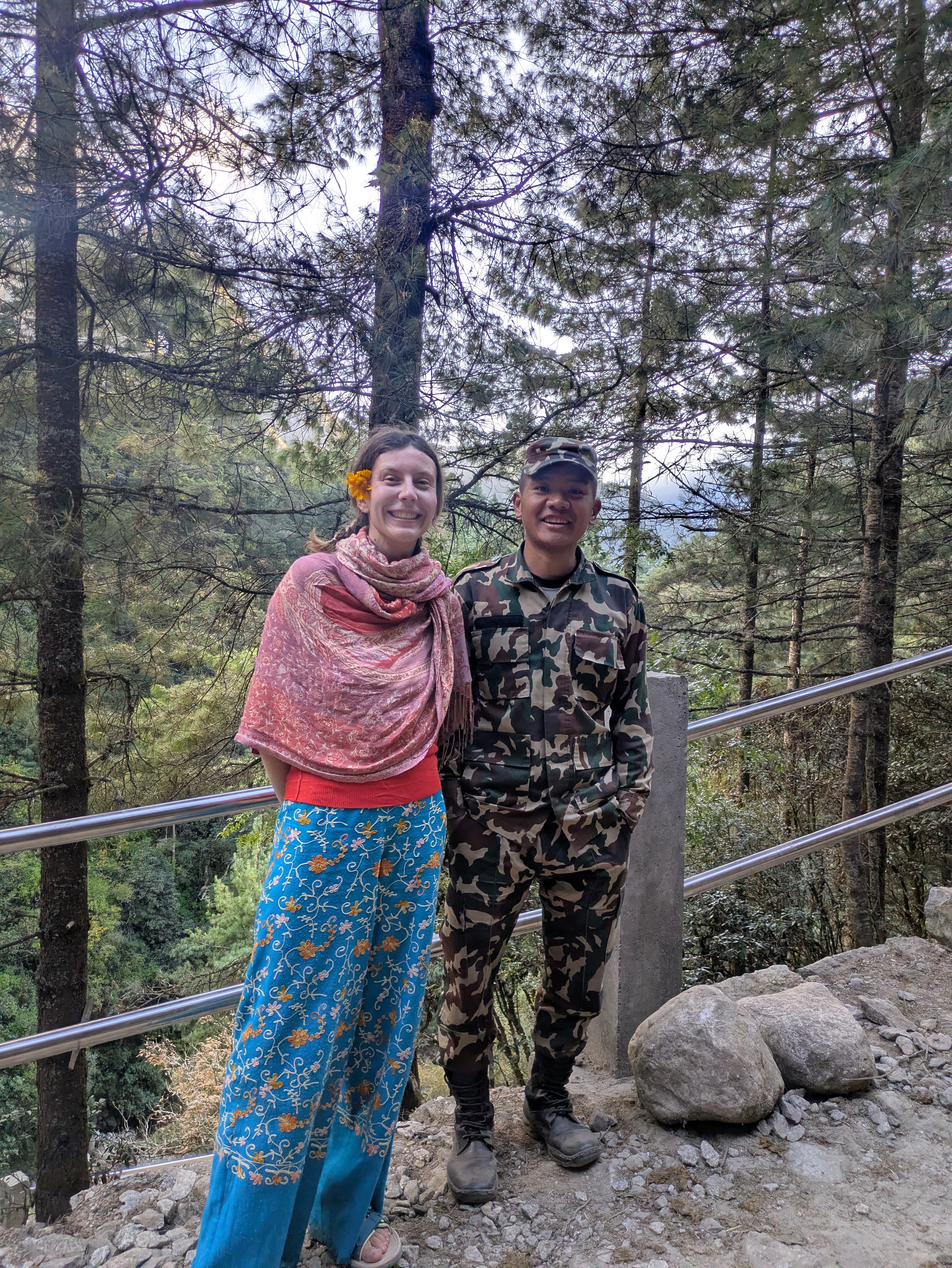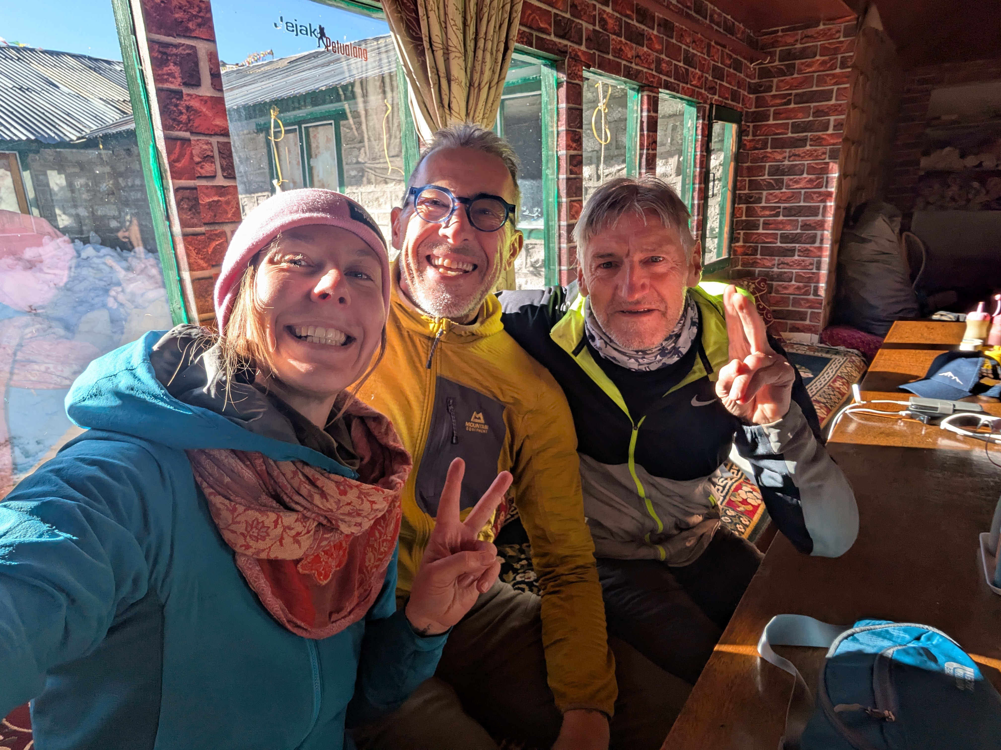 Merci à toutes ces petites âmes vibrantes qui ont croisé mon chemin, je ne pourrai les nommer toutes mais je pense à : Talita (avec qui je n’ai pas de photos malheureusement), cette jolie taïwanaise au Kway rose ; Philippe et Rudy les belges déterminés ; Adam, Kev et Lulu les anglais adorables avec qui j’ai tant échangé, des norvégiens étonnés de mon rythme que j’ai recroisé plusieurs fois, ma super team d’indiens que j’ai retrouvés au moins 4 fois sur mon périple, Borge avec qui j’ai partagé le Kala Pathar et une bière à Lukla, des soldats du parc qui m’ont tout expliqué sur le permis et le parc, Arlette toute pétillante et au petit soin pour son mari Bertrand; Emma et Erwan avec qui j’ai tracé dans la neige; une team de Français que j’ai croisé à deux reprises et on s’est reconnu ; Santos le camionneur qui conduisait comme un king dans la nuit sur les routes effondrées ; tous les Nepali, notamment les porteurs avec qui j’ai rigolé en essayant de discuter : tashi delek !