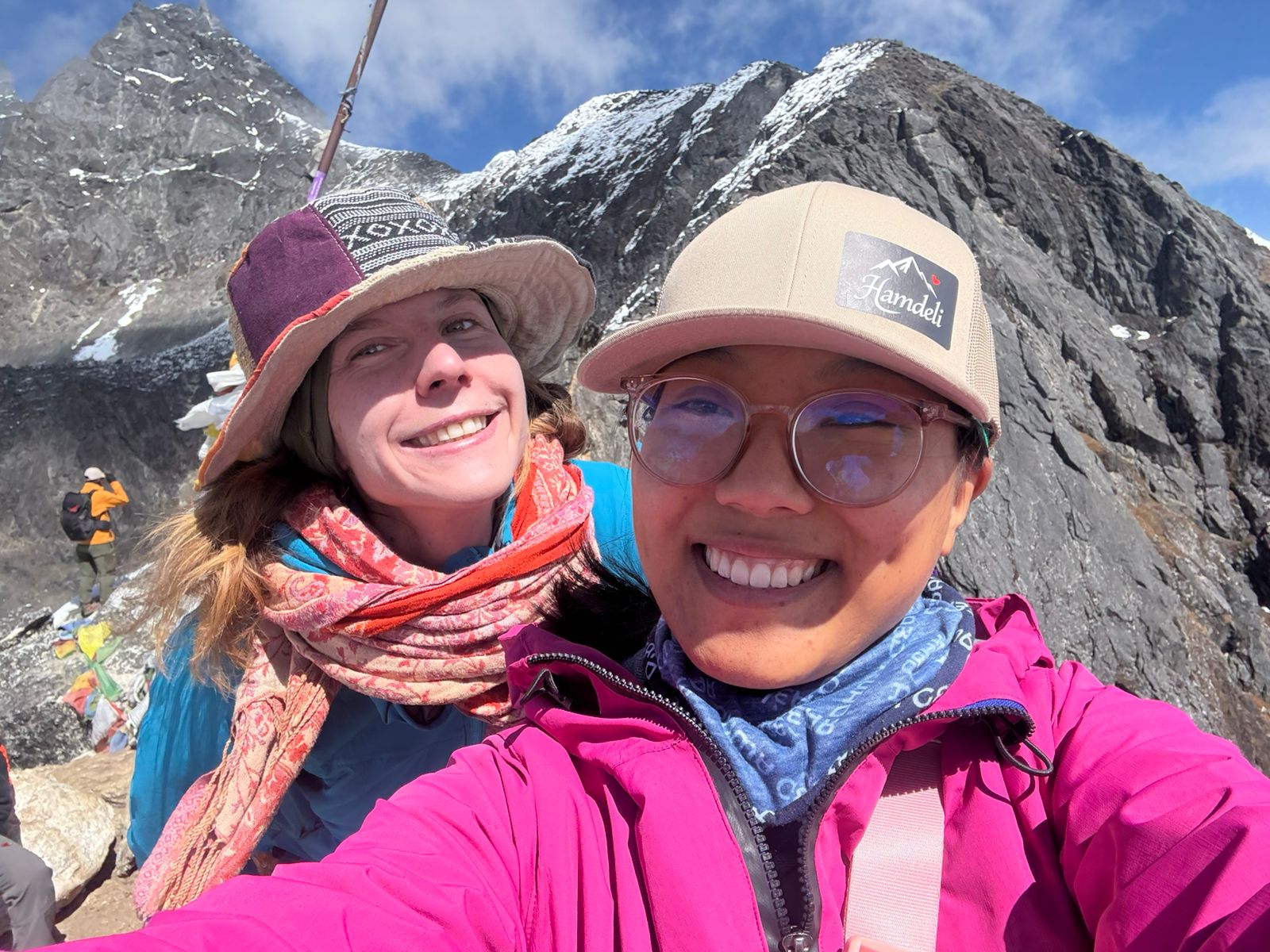 Pour ce deuxième jour, j’avais l’envie de monter vite bien plus haut, de faire un premier 4000 pour m’acclimater aux hauteurs. Je n’imaginais pas encore que ça allait être aussi beau : une vue magnifique sur des géants de 6 000 m, des drapeaux de prière aux confins du ciel, de l’extase et du bonheur.